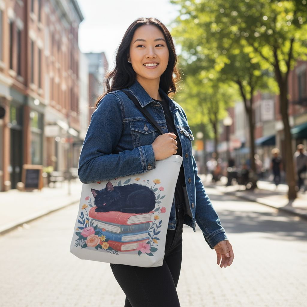 Carry a touch of cozy charm wherever you go with this Black Cat Tote Bag. Featuring a peaceful black cat sleeping on a stack of books surrounded by flowers, this bag is the perfect blend of practicality and style.